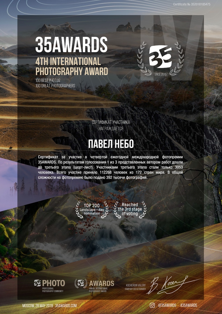 Дизайнер «РДК» Павел Бараников принял участие в 4-ой международной фото-премии 35AWARDS. По результатам голосования одна из трех работ Павла вошла в топ-200 лучших. Чтобы вы понимали – это успех. В конкурсе приняли участие 112 268 человек из 172 стран мира, всего на конкурс было подано 392 тысячи фотографий со всех континентов Земли.